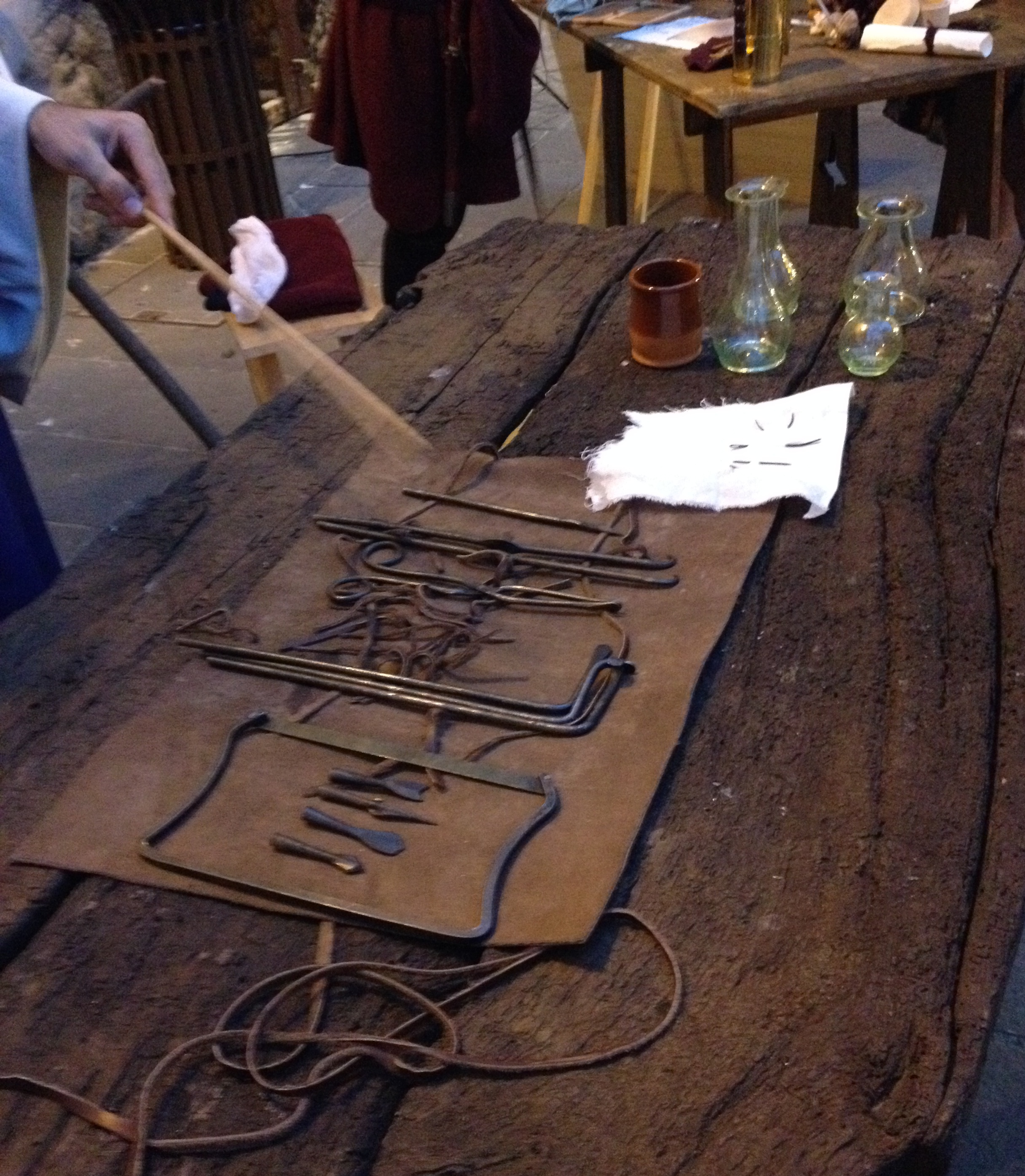 Si on l’interroge, il nous parle des instruments chirurgicaux utilisés pour suturer blessures, scier membres, pratiquer saignées, arracher dents. Mais ce n’est pas lui qui les utilise, non, lui ne se salit pas les mains, il est un théoricien, un descendant d’Hippocrate et Galien. Il n’est pas un porcher ou tanneur qui cherche à aider son prochain avec le peu d’instruments à sa disposition, ceux de son métier : aiguilles pour coudre les peaux, chanvre comme fil de suture et autres.